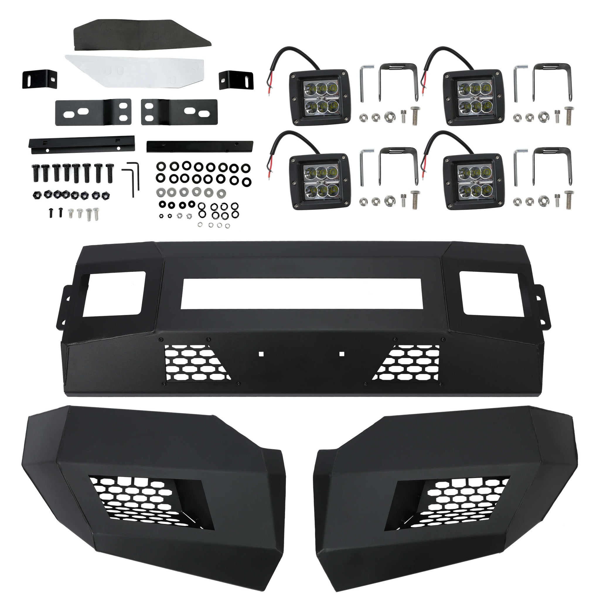 Designed for perfect fit and easy installation: Package Includes: 1 x front Bumper & Mounting hardware as shown. LED lights included. Instruction is included. You will receive 2 packages. Professional assembly is highly recommended.